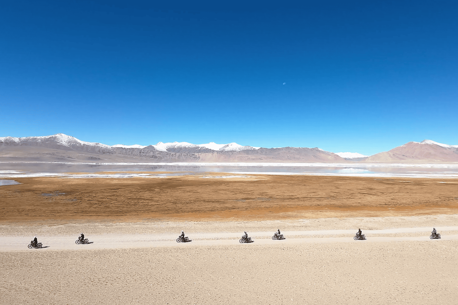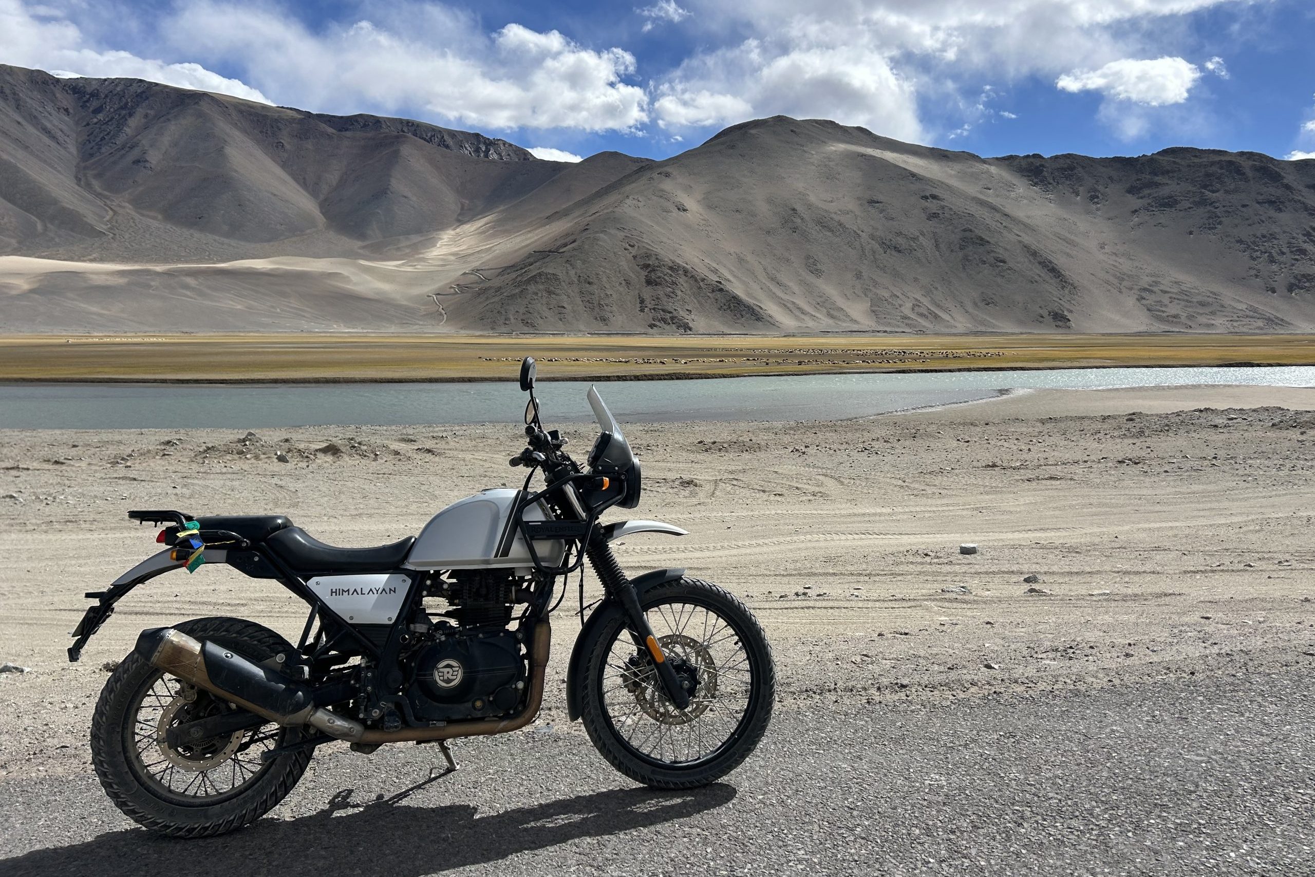 Dès le départ d’Hanle, une petite route mène rapidement à un point de contrôle, où l’équipe s’occupe des formalités d’entrée. Le parcours traverse ensuite l’une des régions les plus reculées du Ladakh, un territoire d’une beauté brute où les montagnes arides se fondent dans l’horizon infini. Après avoir franchi le pont de Mahé, la route asphaltée laisse place à une piste accidentée, avant de se transformer en un tracé sablonneux exigeant plus de technique. Ici, l’aventure prend tout son sens : chacun ajuste sa trajectoire et ressent pleinement la liberté de rouler à moto au cœur de ce désert d’altitude.