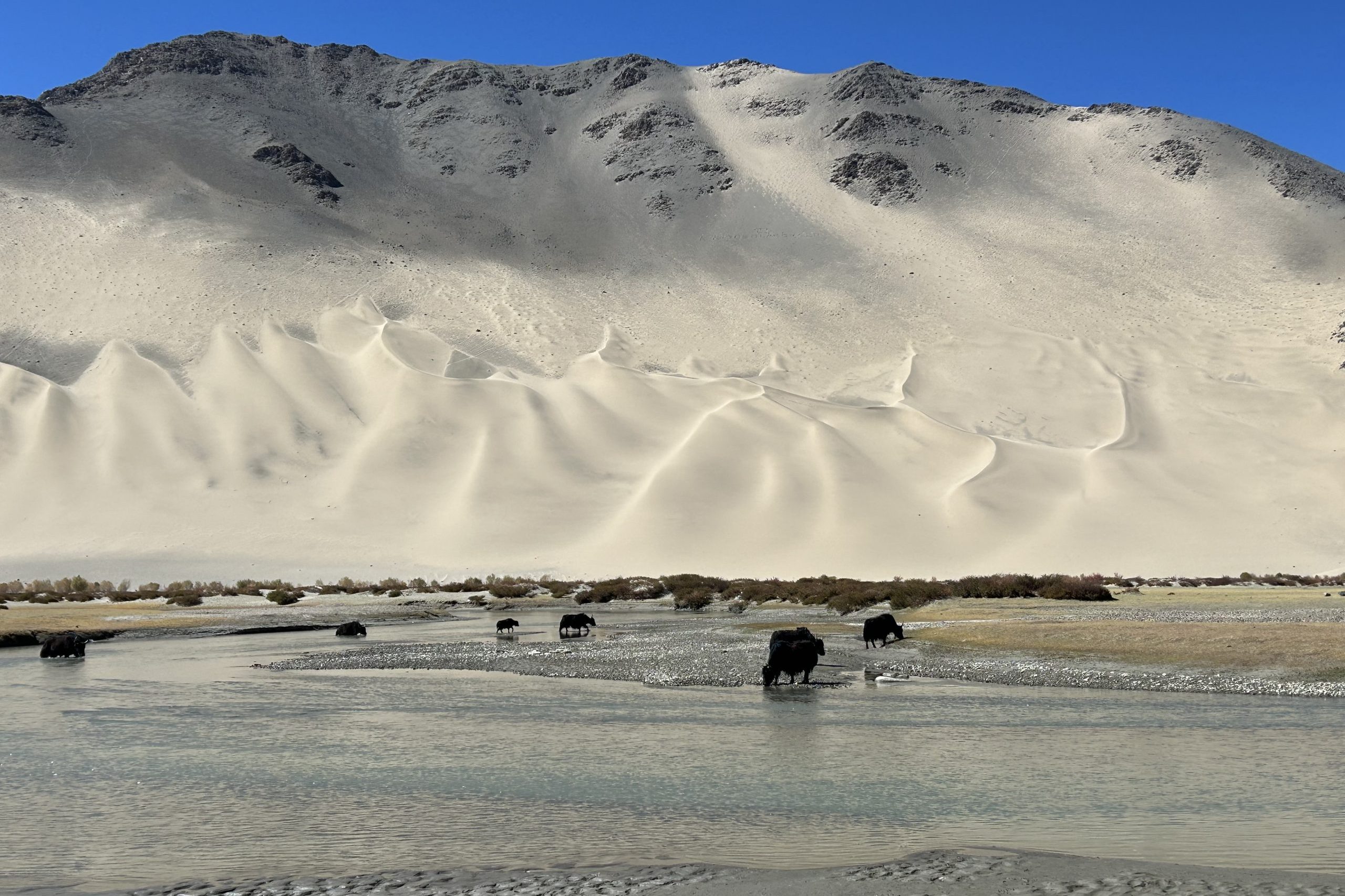 La descente se fait progressivement vers la vallée de la Nubra, autrefois un carrefour stratégique sur l’ancienne route de la Soie. Cette région préservée dévoile un paysage unique, entre dunes de sable, rivières serpentant au pied des montagnes et petits villages aux monastères perchés. L’un des symboles de la vallée reste ses fameux chameaux de Bactriane, reconnaissables à leur double bosse, que l’on aperçoit parfois au détour d’une piste.